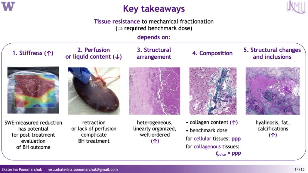 • От Екатерины Максимовны Пономарчук был представлен приглашенный обзорный доклад о последних исследованиях упругих и структурных свойств тканей, влияющих на их восприимчивость к механическому разрушению методом гистотрипсии с кипением и требуемую дозу воздействия.