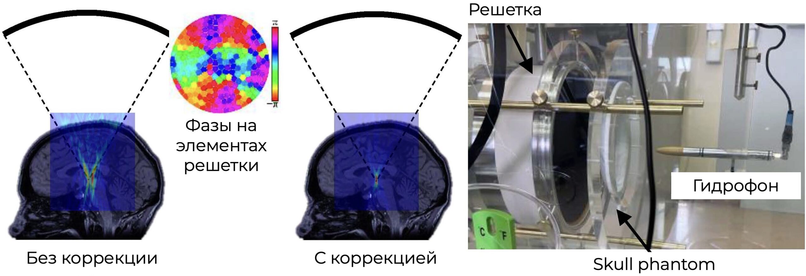 - проводятся эксперименты по коррекции аберраций при фокусировке через уже созданные фантомы черепа с использованием разработанной в Лаборатории мозаичной решетки;