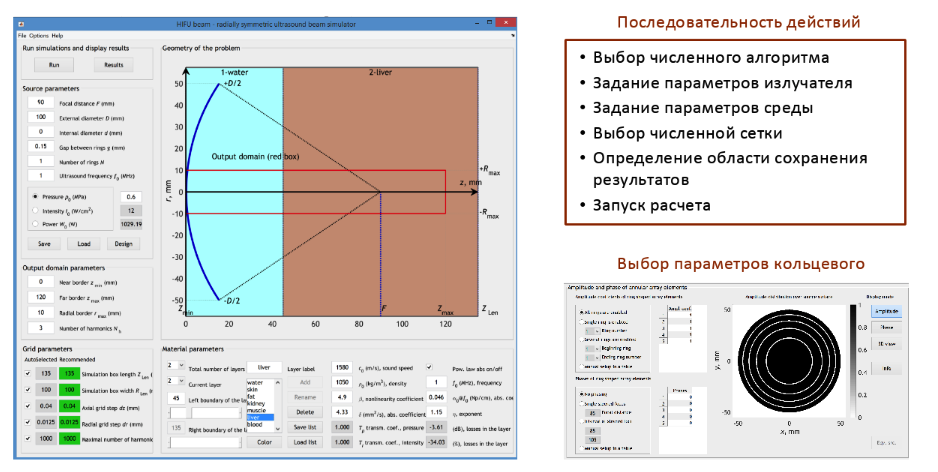 Выводятся и сохраняются двумерные распределения пиковых давлений P+ и P—, интенсивности I, тепловых источников Q, амплитуд An и фаз ϕn гармоник в плоскости оси пучка и в фокальной плоскости).