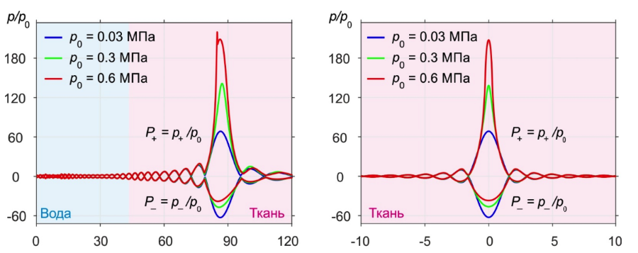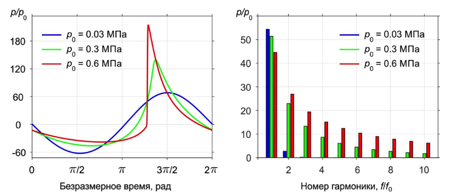 Нелинейно-дифракционное искажение профиля волны, генерация высших гармоник и образование ударного фронта в фокусе при увеличении давления p0 на излучателе.