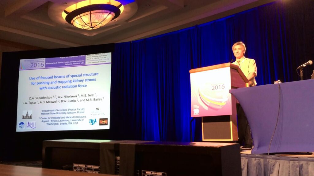 In August 2016 LIMU Heads Vera Khokhlova and Oleg Sapozhnikov presented lectures at the 5th International Symposium on Focused Ultrasound (FUSF16). The Symposium was organized by the Focused Ultrasound Foundation in Bethesda, Maryland, USA.