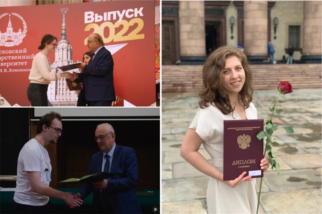 On the 21st of June, a solemn ceremony of awarding diplomas to graduates of the Faculty of Physics took place at the Moscow State University (MSU). All our graduates of the master’s program-2022 Elena Konnova, Liubov Kotelnikova, Polina Pestova, and Daria Chupova were awarded diplomas with honors by the rector of MSU. Fedor Nartov, Oleg Solontsov, Nikita Falkov, and Egor Korovko successfully completed the undergraduate program and got bachelor’s degree. Congratulations to LIMU graduates on their diplomas!