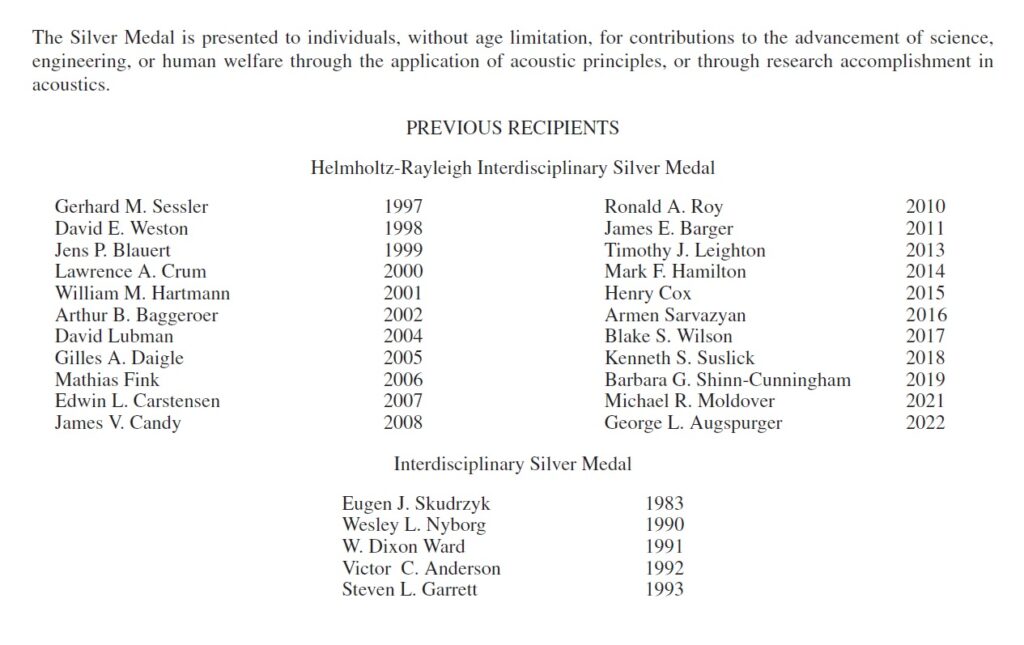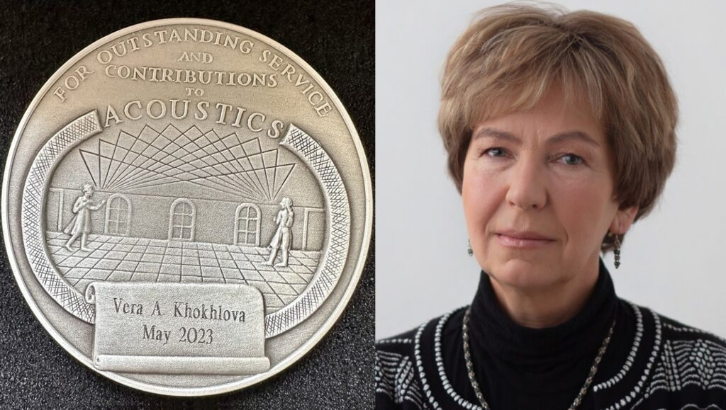 V.A. Khokhlova received the honorary award of the Acoustical Society of America (ASA)- the Rayleigh-Helmholtz Interdisciplinary Silver Medal in Biomedical Acoustics and Physical Acoustics. With over 7,000 international members, ASA is in many ways the most respected community of acousticians. The Silver Rayleigh-Helmholtz Medal is awarded for excellence in interdisciplinary research in the field of acoustics. Among the previous recipients of the medal are not only scientists from the USA, but also from other countries, including world-known acousticians M. Fink (France), T. Leighton (Great Britain), and G. Daigle (Canada). This year, for the first time, the medal was given to a Russian scientist. The ASA announcement for this award recognizes Vera Khokhlova’s contributions to the application of nonlinear acoustics to medical ultrasound and her important role in the evolution of this field. We cordially congratulate Vera!