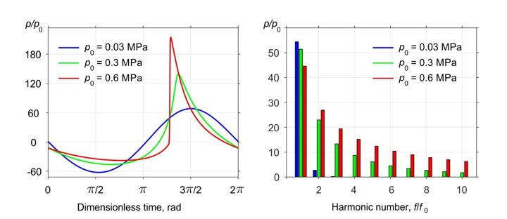 Nonlinear-diffraction waveform distortion, generation of higher harmonics and shock formation at the focus at increasing source pressure p0.