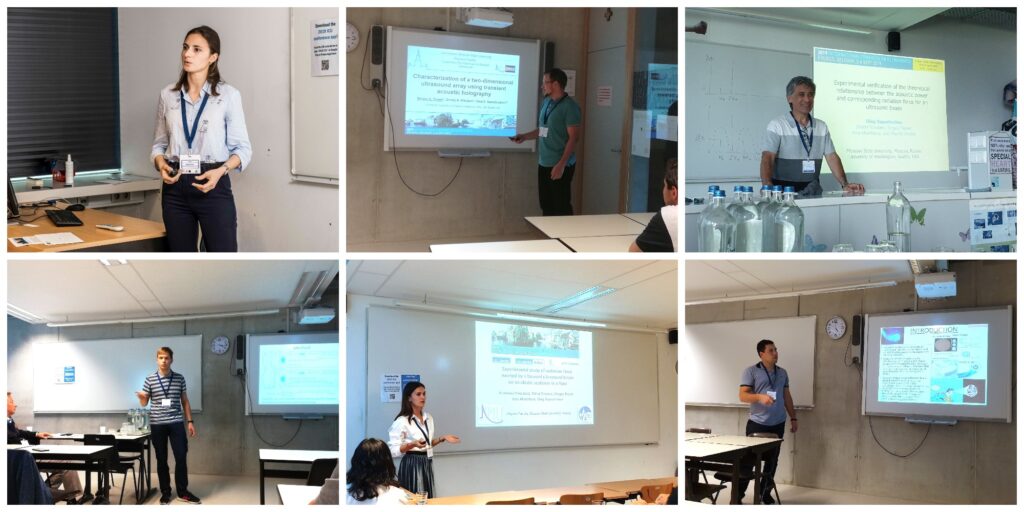 Oleg Sapozhnikov gave a talk in the section “Nonlinear Acoustics and Ultrasonics”, Sergey Tsysar and Dmitry Nikolaev presented their results in the section “Acoustic Holography”, Suren Petrosyan made a report in the section “Ultrasound imaging and microscopy”, and Anastasiya Nikolaeva and Alisa Krokhmal presented results of their recent studies in the section “Acoustic tweezers and particle manipulation”.