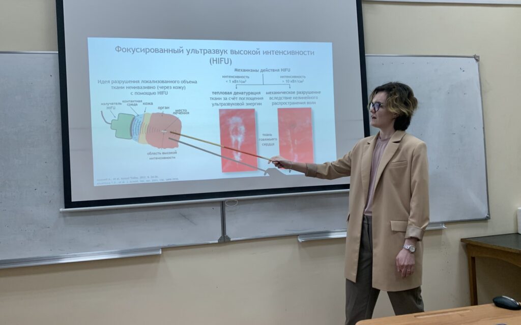 At the same time, the Scientific Conference “Lomonosov Readings-2022” was held in a mixed format. In the section “Physics” from LIMU 2 reports were presented. P.B. Rosnitsky spoke in the subsection “Medical Physics”, presenting the results of the work on the topic “Boiling histotripsy method for mechanical ablation of human prostate tumors EX VIVO”. Postgraduate E.M. Ponomorchuk in the subsection “Photonic and quantum technologies, digital medicine” spoke about the results of the work “Elastic properties of the human hematoma model and its liquefaction by pulsed focused ultrasound”.