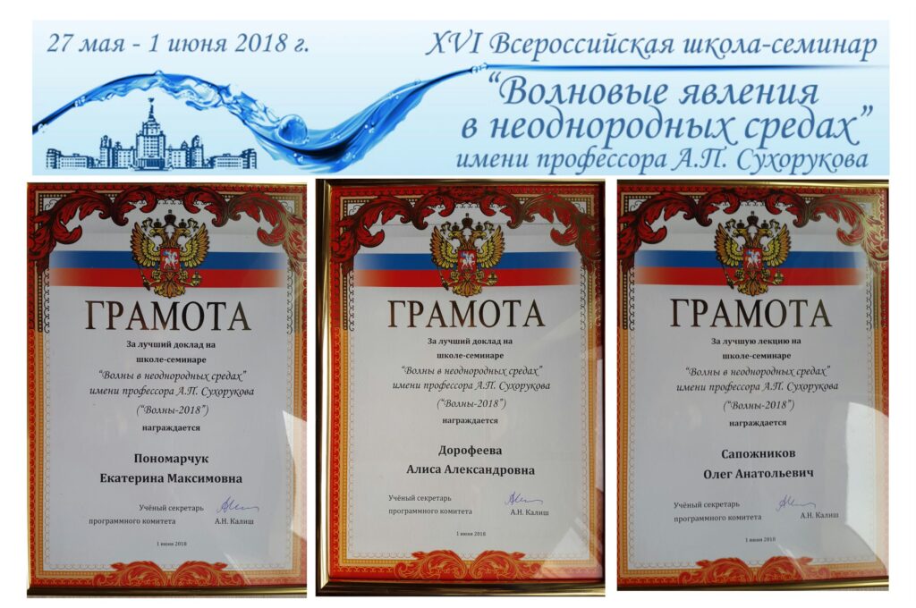 From 27th of May to 1st of June 2018 LIMU team participated in the XVI All-Russian School-seminar «Physics and application of microwaves» named after Professor Anatoliy Sukhorukov («Waves-2018»), that was held in the rest home of MSU “Krasnovidovo”. The program of the school-seminar “Waves-2018” included twelve sections. From the LIMU team a delegation of eighteen students and researchers participated in the school-seminar. Fifteen oral talks were presented from the Laboratory in the section “Acoustics of inhomogeneous media”, one talk was made in the section “Acoustoelectronics and acoustooptics”. LIMU students Alisa Dorofeeva and Katya Ponomarchuk were awarded with diploma for the best reports in the sections “Acoustoelectronics and acoustooptics” and “Acoustics of inhomogeneous media”, respectively. A lecture «Nonlinear wave phenomena in the treatment of urolithiasis» made by professor O.A. Sapozhnikov was noted by the organizing committee of the conference as the best lecture.