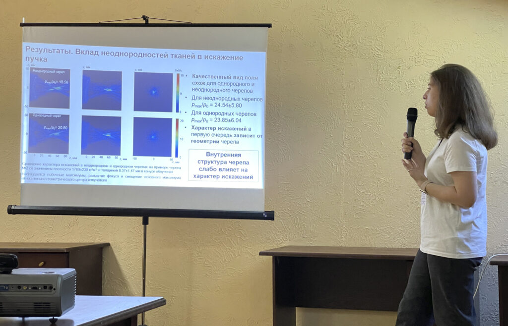 From the LIMU 9 reports were presented by PhD students E.O. Konnova, L.M. Kotelnikova, D.D. Chupova, P.A. Pestova, Sh.A. Asfandiyarov and A.V. Kvashennikova, MS students F.A. Nartov and O.V. Solontsov and research fellow S.A. Tsysar. According to the results of the voting, four members of our laboratory were awarded certificates for the best presentation: Asfandiyarov Shamil in the section “Acoustics of inhomogeneous media”, Nartov Fedor for the best poster report, Konnova Elena in the section “Mathematical problems of wave physics” and Pestova Polina in the section “Bio- and medical applications of wave physics”.