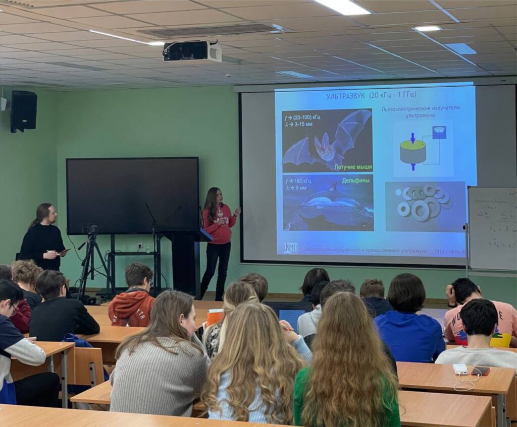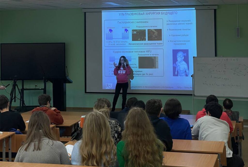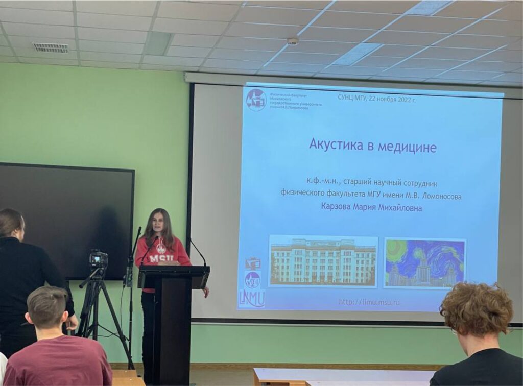 Within the framework of the meeting, Maria Karzova told the students about physical methods of influence in medicine, the prospects of ultrasound surgery in the future, and the possibilities of scientific work at the Faculty of Physics of Moscow State University and, in particular, in the LIMU laboratory.