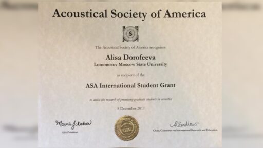Alisa Dorofeefa received a Student Award 2018 from the Acoustical Society of America to assist the research of promising graduate students in acoustics. Congratulations Alisa!