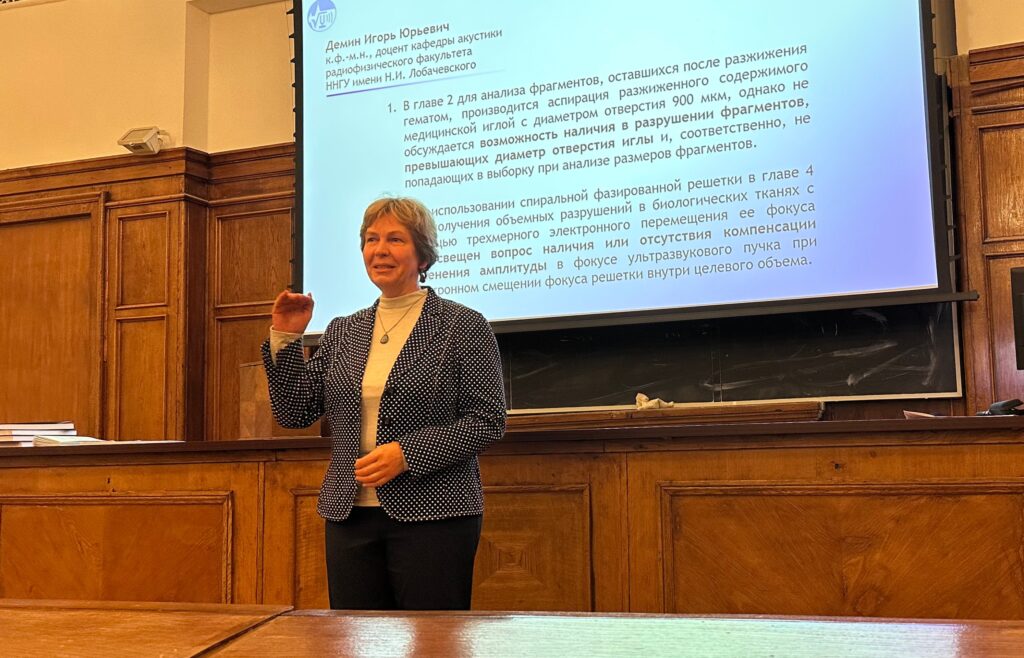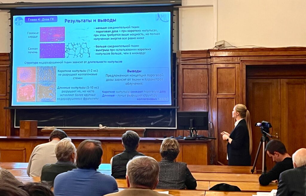On October 19, 2023, at the Physics Faculty, MSU, a meeting of the Dissertation Council MSU.013.6 was held, where a LIMU 4th year graduate student Ekaterina Ponomarchuk successfully passed the defense of her PhD dissertation: “Mechanical fractionation of soft tissues in pulsed focused shock wave fields”.
