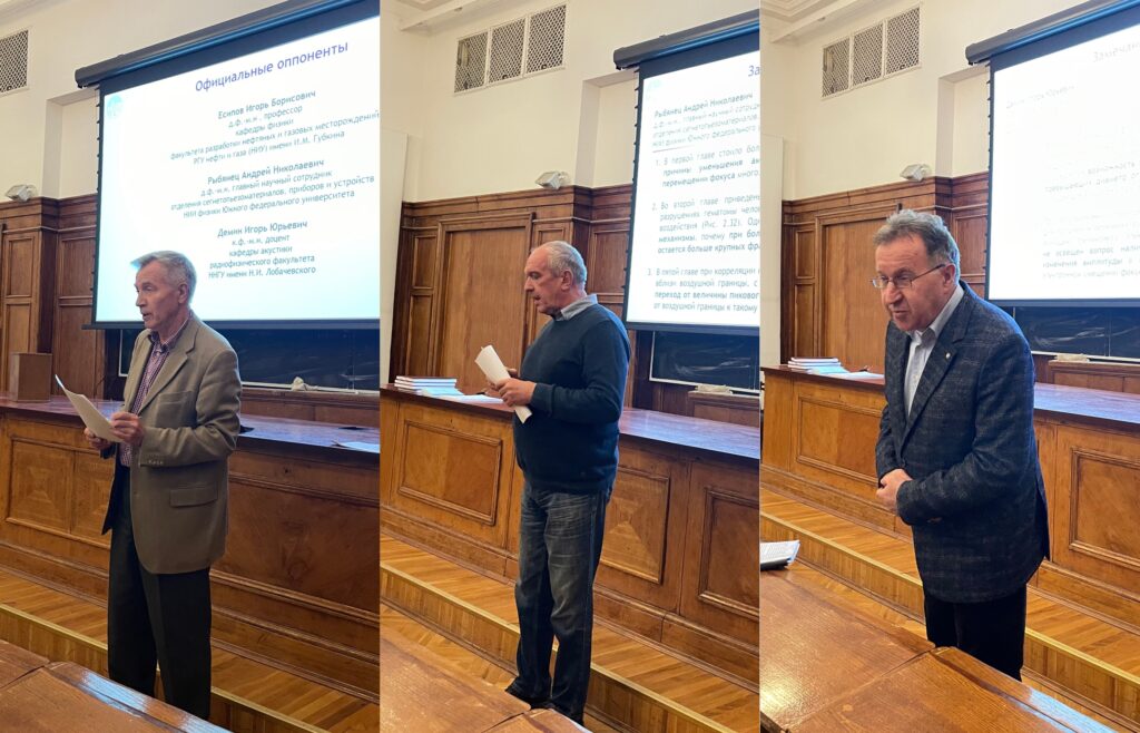 All three opponents of the dissertation traveled to MSU to speak at the defense: D.Sc. Igor B. Esipov (National University of Oil and Gas «Gubkin University», Moscow), D.Sc. Andrey N. Rybyanets (Southern Federal University, Rostov-on-Don) and Ph.D. Igor Y. Demin (Lobachevsky State University of Nizhny Novgorod, Nizhny Novgorod).