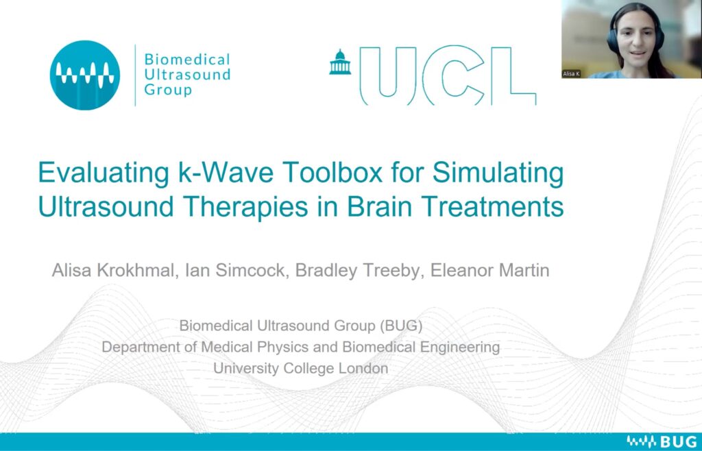- Алиса Крохмаль представила доклад о моделировании ультразвукового поля при транскраниальной фокусировке в мозг в секции «Фокусированный ультразвук: физика, моделирование и аппаратное обеспечение».