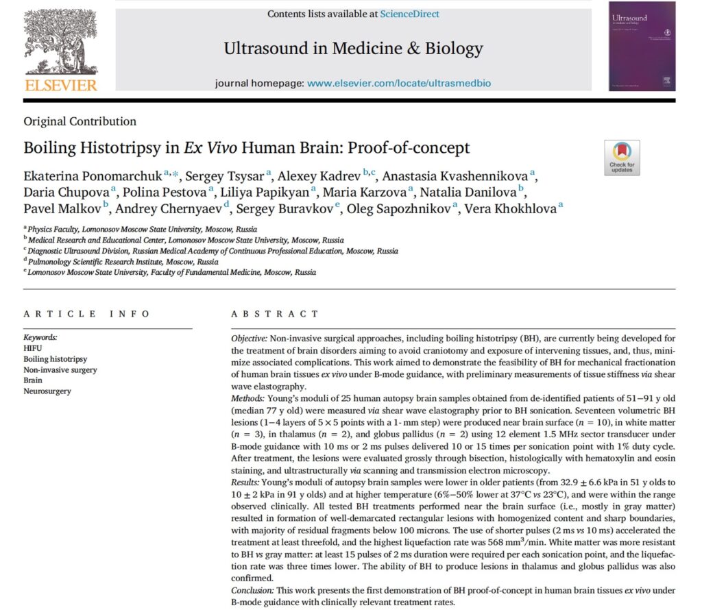 Проведенные в нашей лаборатории численные эксперименты уже показали возможность реализации условий и безопасного использования гистотрипсии с кипением при транскраниальной фокусировке ультразвука в ткани мозга, в том числе и близко к черепу. Однако сама способность механически разрушать ткань человеческого мозга с использованием данного метода еще не была исследована экспериментально. Результаты исследований, опубликованные в нашей статье совместно с Университетской клиникой МНОИ МГУ, НИИ пульмонологии и НИИ морфологии человека были в первую очередь посвящены экспериментальной демонстрации возможности ГК-разрушения тканей головного мозга человека, для начала, ex vivo (т.е. вне организма) и в отсутствие черепа.
