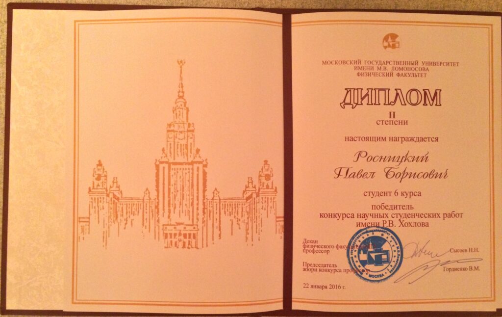 Наш выпускник Павел Росницкий получил диплом второй степени на конкурсе дипломных работ физического факультета 2015/2016 гг. с проектом «Влияние угловой апертуры медицинских ультразвуковых излучателей на параметры нелинейного ударно-волнового поля в фокусе».