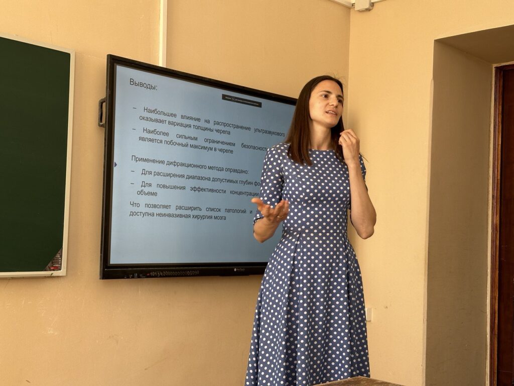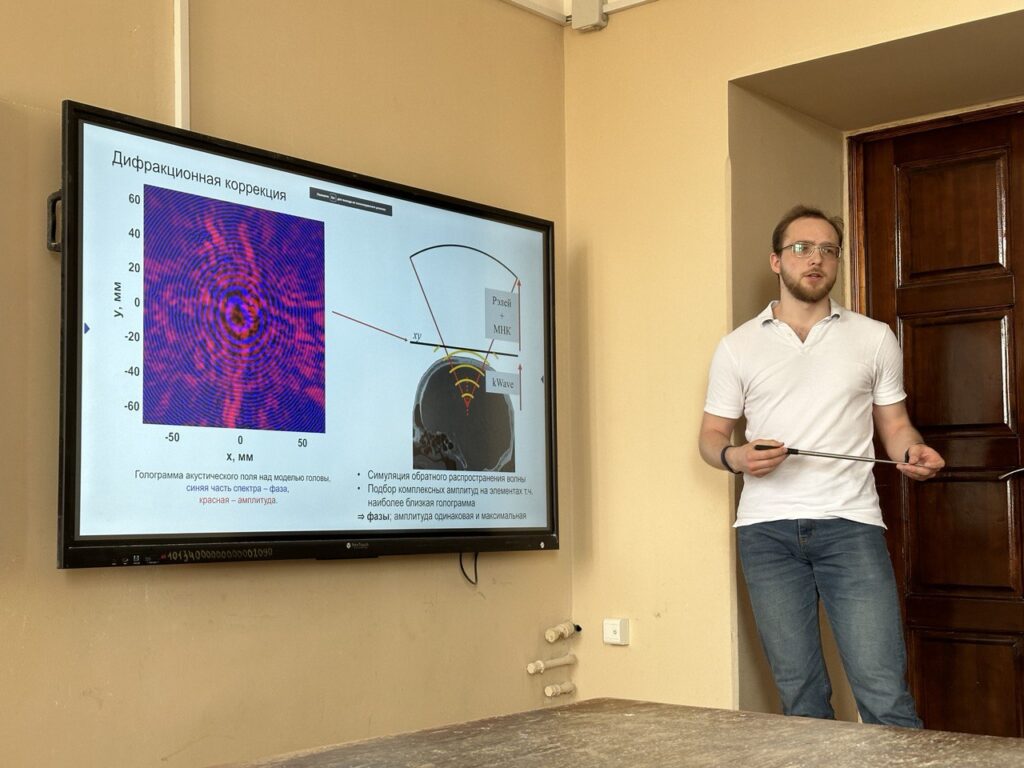 - Солонцова Олега «Сравнение лучевого и дифракционного методов коррекции аберраций при фокусировке ультразвука через кости черепа» (научный руководитель Хохлова Вера Александровна, рецензент Крохмаль Алиса Александровна).