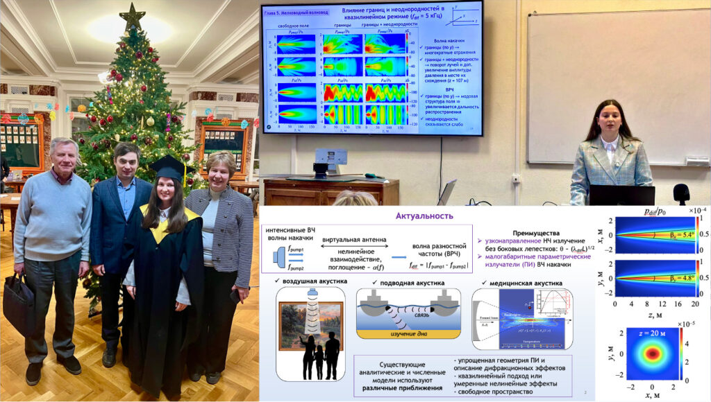 23 декабря 2024 г. на физическом факультете МГУ состоялась защита кандидатской диссертации «Численное моделирование генерации волны разностной частоты в трёхмерных ультразвуковых пучках в условиях сильного проявления нелинейности среды» сотрудницы LIMU Анастасии Квашенниковой.