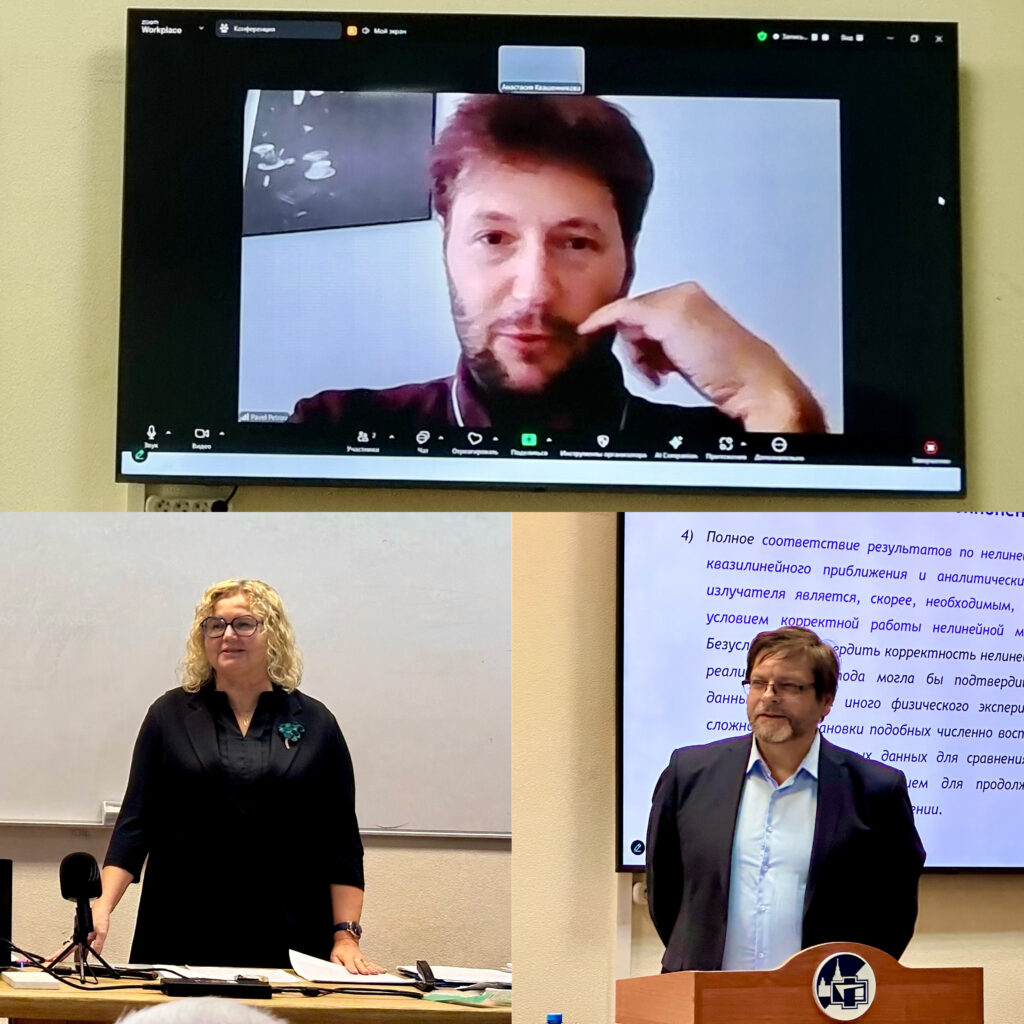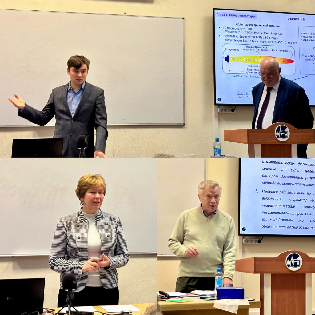 На защите очно выступили два оппонента диссертации: д.ф.-м.н. Козубская Татьяна Константиновна (Институт прикладной математики имени М.В. Келдыша РАН, г. Москва) и к.ф.-м.н. Савицкий Олег Анатольевич (Акустический институт имени академика Н.Н. Андреева, г. Москва). Третий оппонент диссертации д.ф.-м.н. Петров Павел Сергеевич (Тихоокеанский океанологический институт ДВО РАН, г. Владивосток) выступил на защите дистанционно.