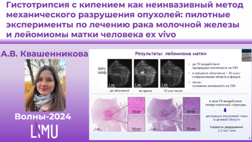 28 мая, 2024 Гистотрипсия с кипением как неинвазивный метод механического разрушения опухолей: пилотные эксперименты по лечению рака молочной железы и лейомиомы матки человека ex vivo. А.В. Квашенникова. Доклад на XXXV Всероссийской Школе-семинаре «Волновые явления: физика и применения» имени профессора А.П. Сухорукова (Волны–2024) Доклады