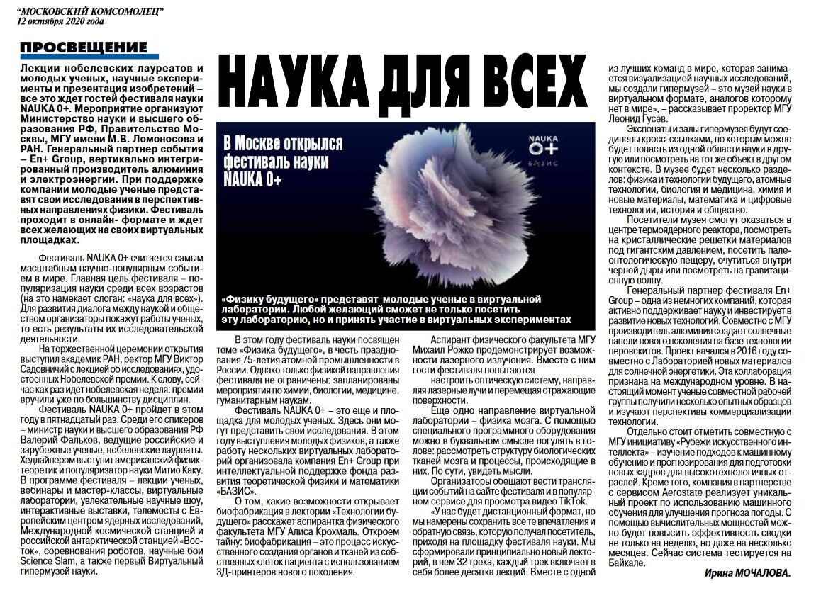 В рамках Всероссийского Фестиваля Науки 10 октября 2020 г. аспирантка LIMU Алиса Крохмаль прочитала онлайн-лекцию на тему «Ультразвук как инструмент биофабрикации».  В биоинженерии активно развивается направление биофабрикации, когда из тканевых сфероидов – конгломератов живых клеток размером порядка 0.2 мм – формируются жизнеспособные ткани, которые в будущем смогут заменить больные ткани человека. В лекции рассказывается о роли ультразвука и применении акустической радиационной силы для перемещения тканевых сфероидов и формирования трехмерных тканеинженерных конструктов. Такой подход в медицине позволит полностью отказаться от использования природных или синтетических биоматериалов, клиническое использование которых связано с риском отторжения и развития воспалительных процессов.