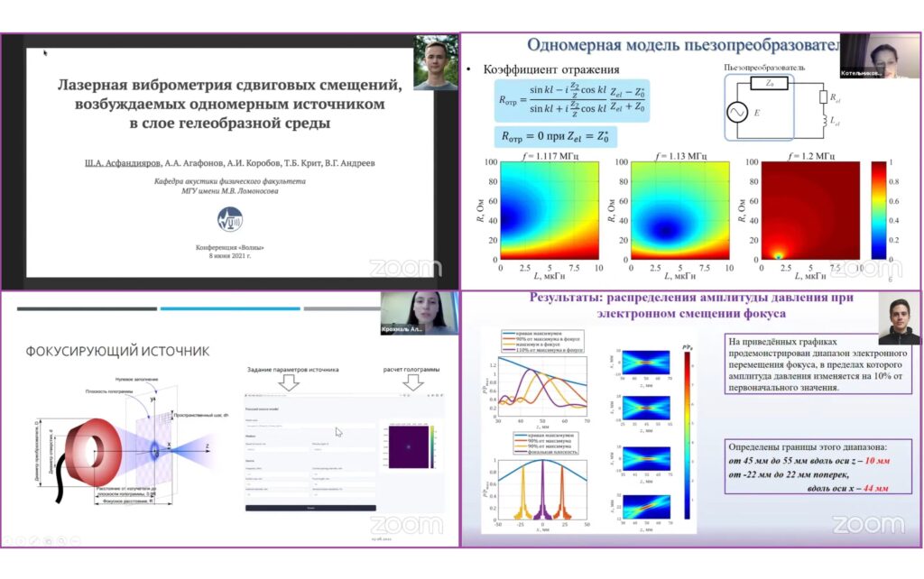 С 6 по 11 июня 2021 г. прошла XXXII Всероссийская школа-семинар «Волновые явления: физика и применения» имени А.П. Сухорукова («Волны-2021»), которая также проводилась в дистанционном формате. Программа школы включала 14 секций. От лаборатории LIMU участие в школе принимали студенты Л.М. Котельникова (секция «Акустоэлектроника и акустооптика»), Д.Д. Чупова, Ф.А. Нартов (секция «Био- и медицинские приложения волновой физики») и аспиранты Д.А. Николаев, С.А. Петросян, А.В. Тюрина (секция  «Акустика неоднородных сред»), А.А. Крохмаль (секция «Математическое моделирование в задачах волновой физики») и Ш.А. Асфандияров (секция «Био- и медицинские приложения волновой физики»).