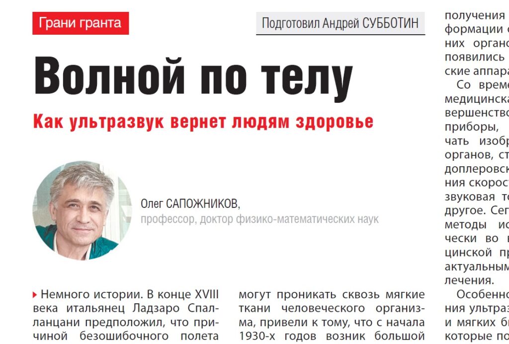 Корреспондент широко известной в российских научных кругах газеты «Поиск» взял интервью у соруководителя LIMU О.А. Сапожникова в связи с успешным завершением проекта «Волновые явления при распространении ультразвука в жидкости в присутствии рассеивателей и поглотителей конечного размера», выполненного при поддержке Российского фонда фундаментальных исследований. В опубликованной заметке «Волной по телу» (№43 за 2023 г.) кратко рассказано об истории ультразвука и о работах LIMU в рамках проекта. Статья была анонсирована в телеграм-канале Российской академии наук: t.me/rasofficial. В проекте были, в частности, исследованы физические процессы, на которых основано недавно возникшее новое направление в литотрипсии – радиоимпульсная ультразвуковая литотрипсия (BWL — Burst Wave Lithotripsy). В этом методе с помощью узкополосных импульсов фокусированного ультразвука производится дистанционная фрагментация почечных камней. Вкладом участников LIMU в исследования по BWL явилось теоретическое моделирование физических процессов, на которых основана как фрагментация камней, так и визуализация механических напряжений.